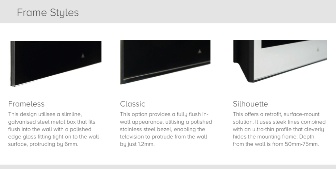 Designed to be fully flush mounted into the wall for the ultimate in minimalism, leaving only the glass and a 1 mm satin black surround visible. Available in a variety of colours and in sizes 16″ to 55″. |