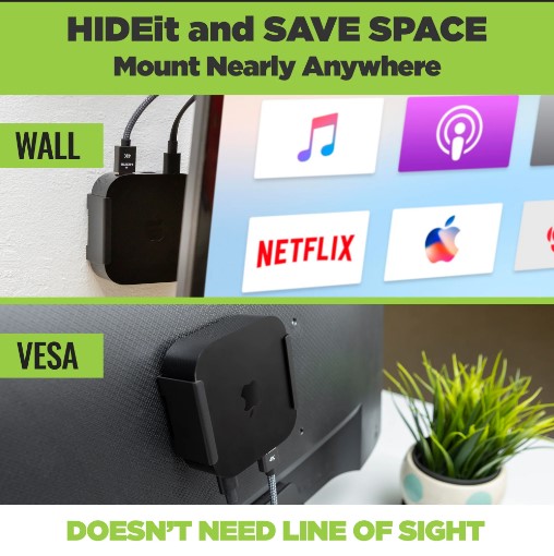 Eliminate messy cords and HIDE your Apple TV 4K 3rd Generation with the HIDEit Apple TV 4K Wall Mount! Designed with simplicity in mind, our Apple TV 4K 3rd Gen Wall Mount installs in three easy steps and cutouts align with the vents on the Apple TV 4K to allow for proper airflow. With added VESA holes, you have the option to mount your 2022 Apple TV directly to the back of your TV! You don’t have to worry about signal interference while mounted behind the TV thanks to the Bluetooth technology used in the Apple TV remote. So, where will you HIDE your Apple TV 4K?