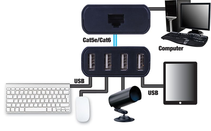 - Allows USB 2.0 signals to be transmitted over a single Cat5e/6 cable